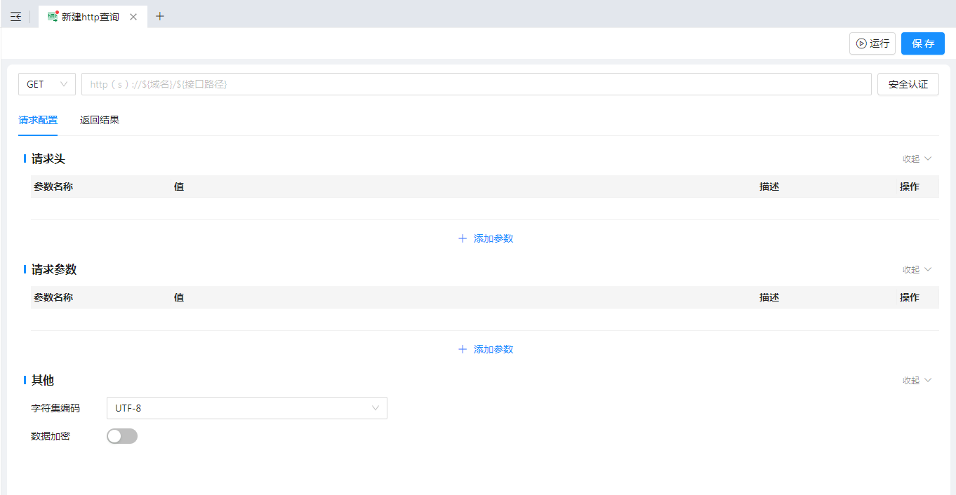 创建http查询接口数据时,需要进行“请求”和“返回”的配置。