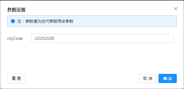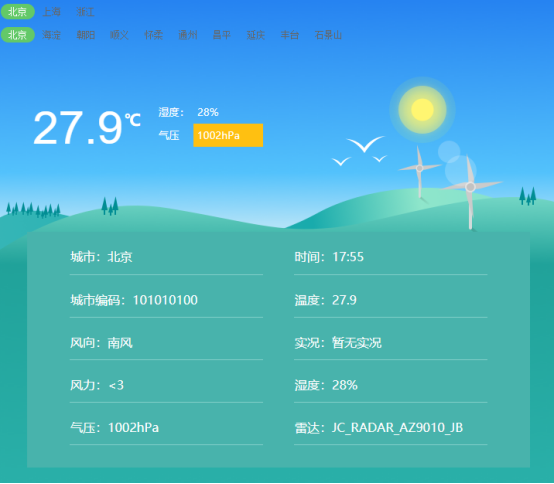 我们以“城市天气预报”为例,通过“接口数据”调用某城市的实时天气数据,进行数据展示。