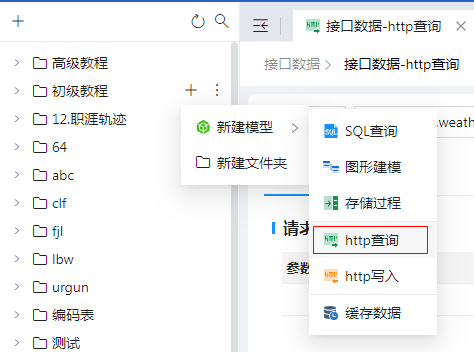 点击全局“+”或某目录的“+”选择新建模型“http查询”,创建一个http查询接口数据,为报表的制作提供数据源。