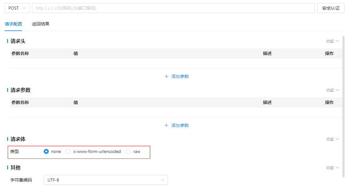 主要根据访问的接口配置请求方式、访问地址以及相关的参数。其中,请求方式分为两种:GET和POST,根据请求接口允许访问的方式进行配置。