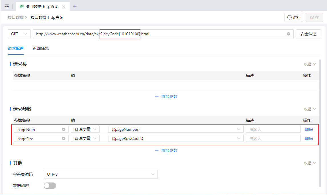 第一步:将创建好的http查询接口数据添加到数据源中,此处会显示我们创建时定义的参数,如下图: